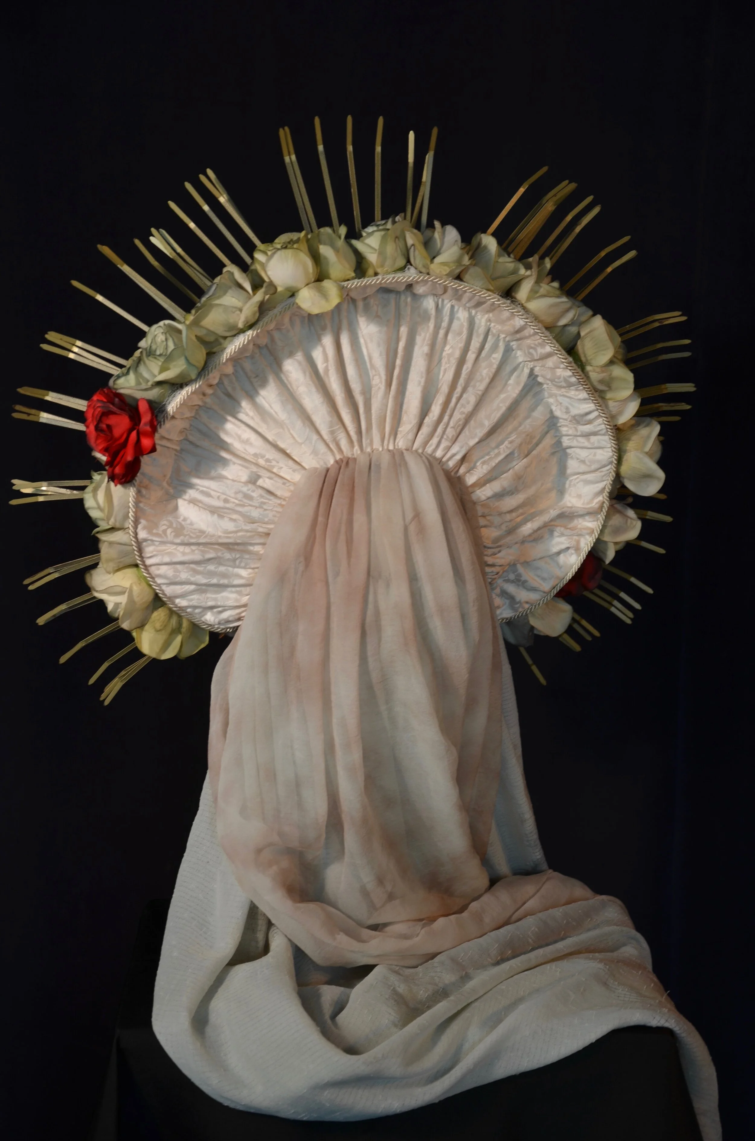Above: Wire frame headdress - 2019 production of Women of _______: a song not song, at University of Texas at Austin Department of Theatre and Dance. Constructed from millinery wire, tulle, hand-painted silk flowers, found objects, silk jacquard, silk chiffon, upholstery trim, spray paint, Dye-Na-Flow, Fosshape, and zip ties.